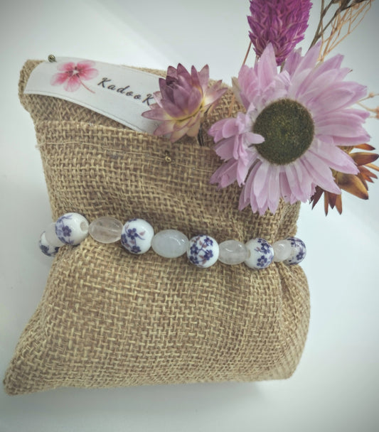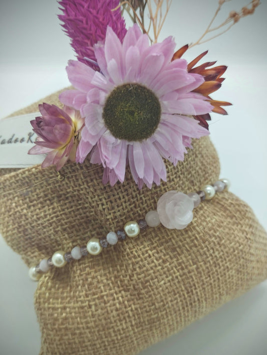 Armbandje met Rozenkwarts-roosje, parels & glasfacetten