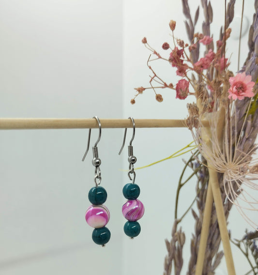 Oorbellenset trio Keramiek Petrol / Pink - hangertjes (RVS/Zilver)