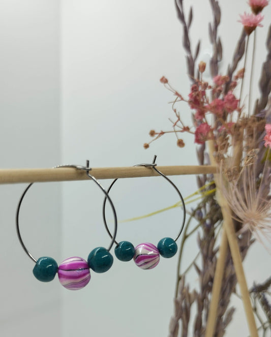 Oorbellenset trio Keramiek Petrol / Pink - Rond (RVS/Zilver)