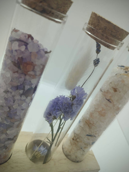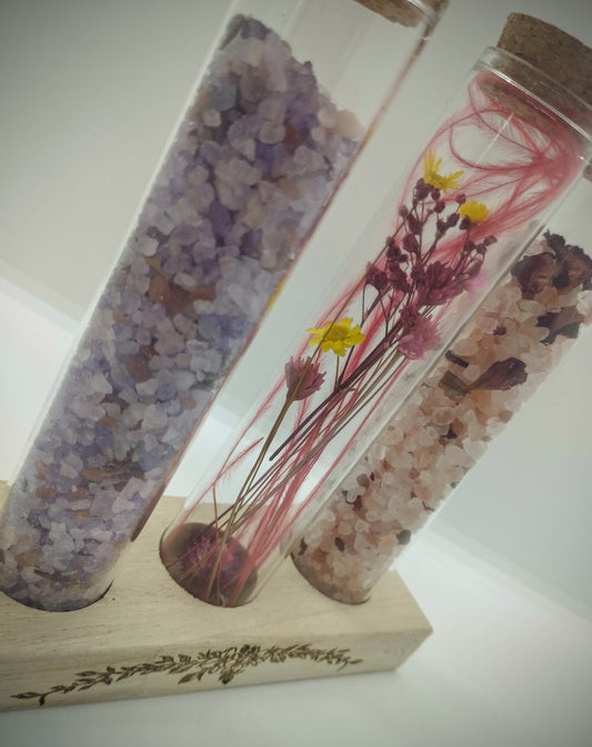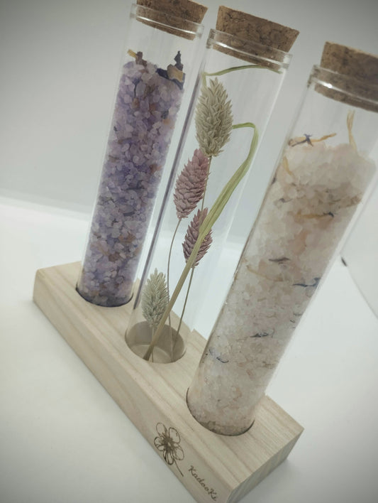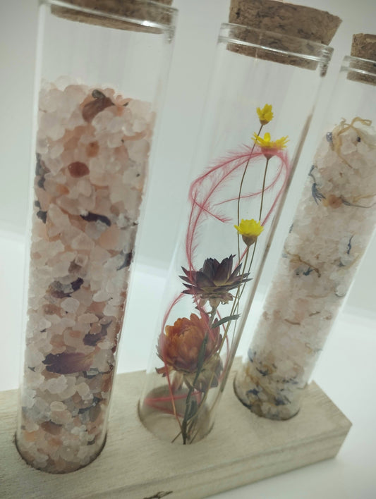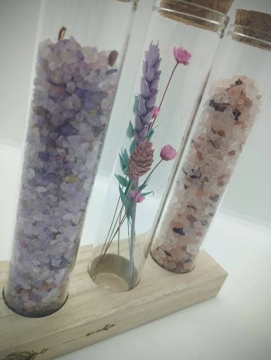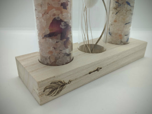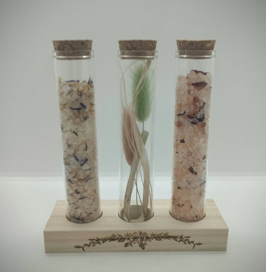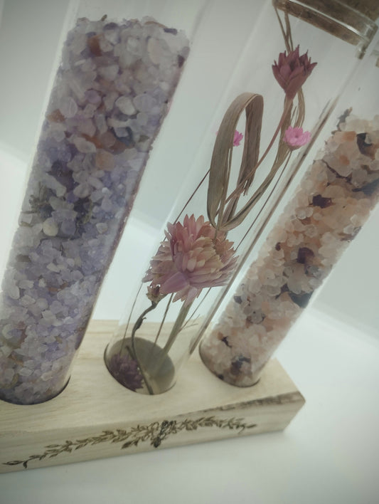 Trio proefbuisjes op gegraveerde houten staander met Badzout & droogbloemetjes